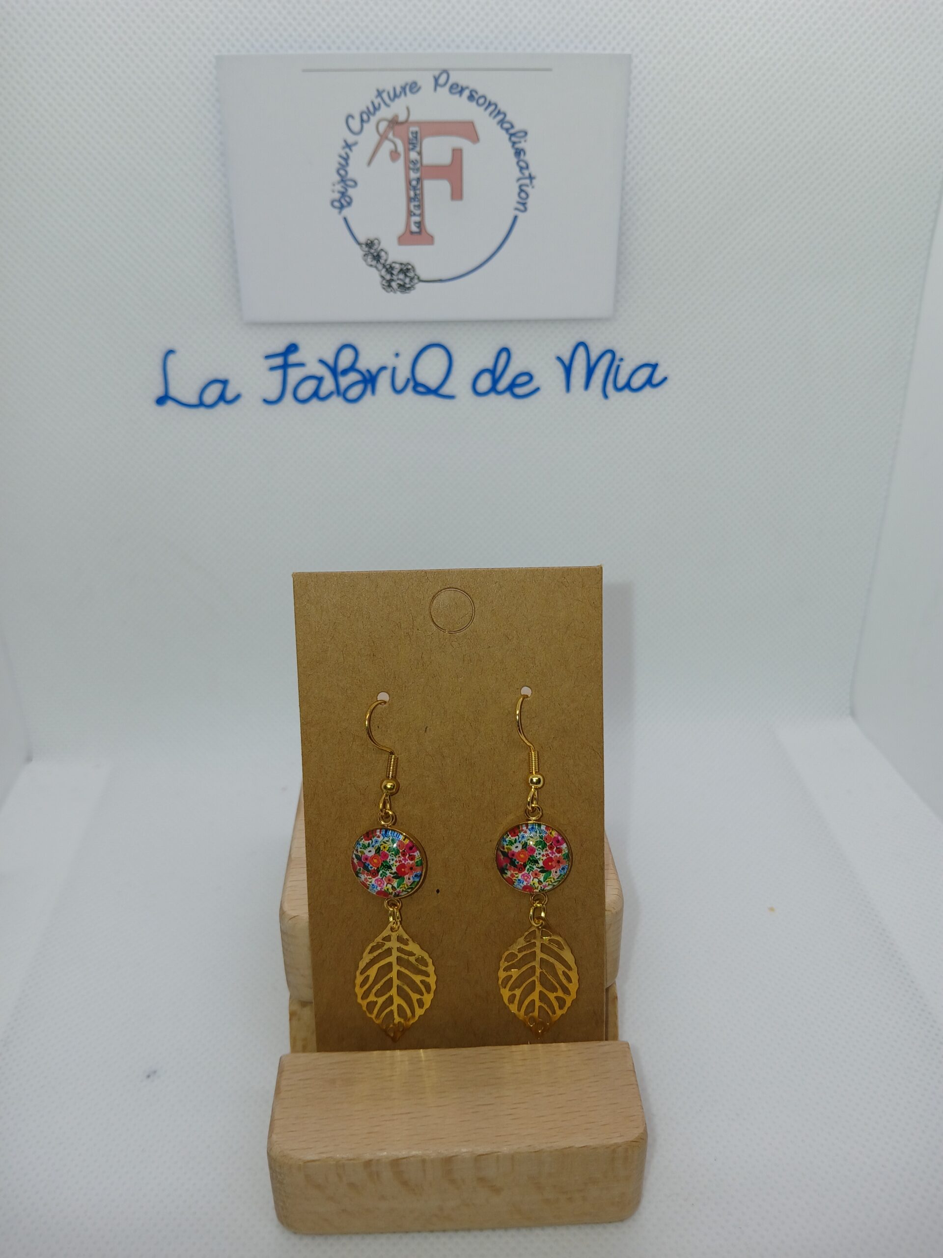 La boucle d’oreille est composée d’un cabochon fleuri et d’une feuille doré