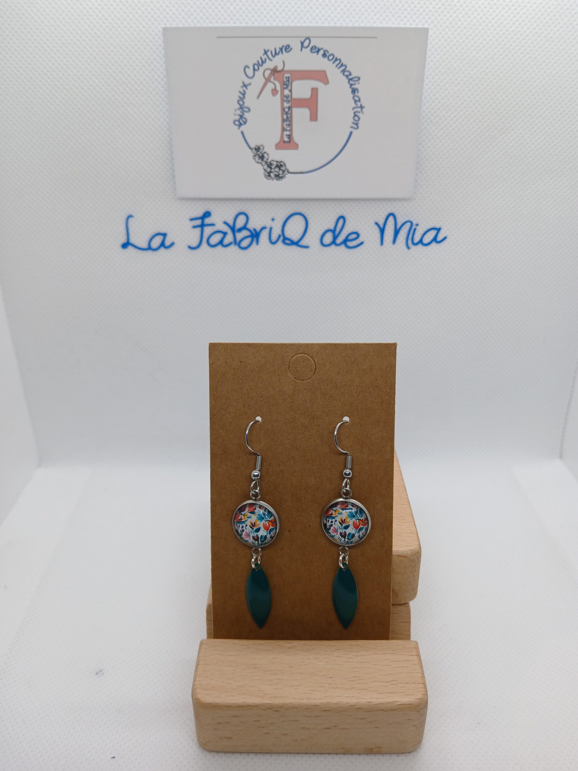 La boucle d’oreille est composée d’une goutte verte olive et d’un cabochon