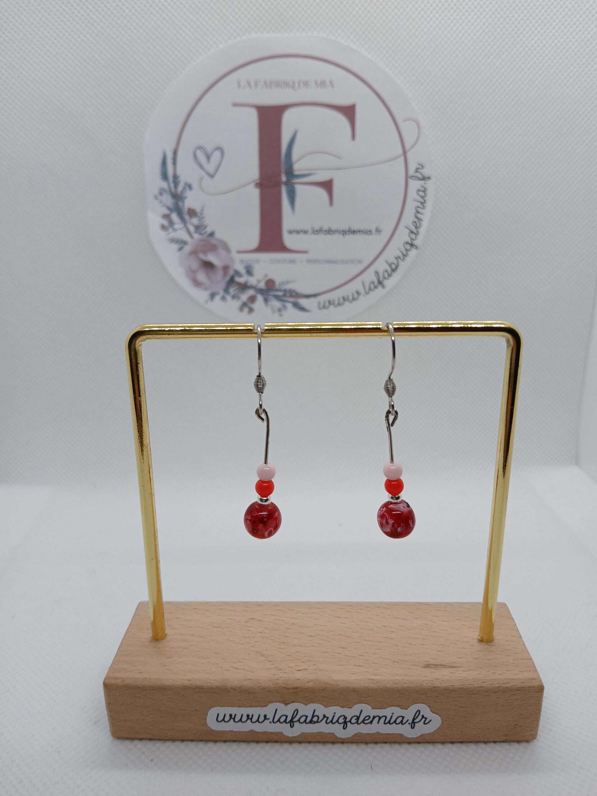 La boucle d’oreille est composée d’une tige agrémentée de perles roses