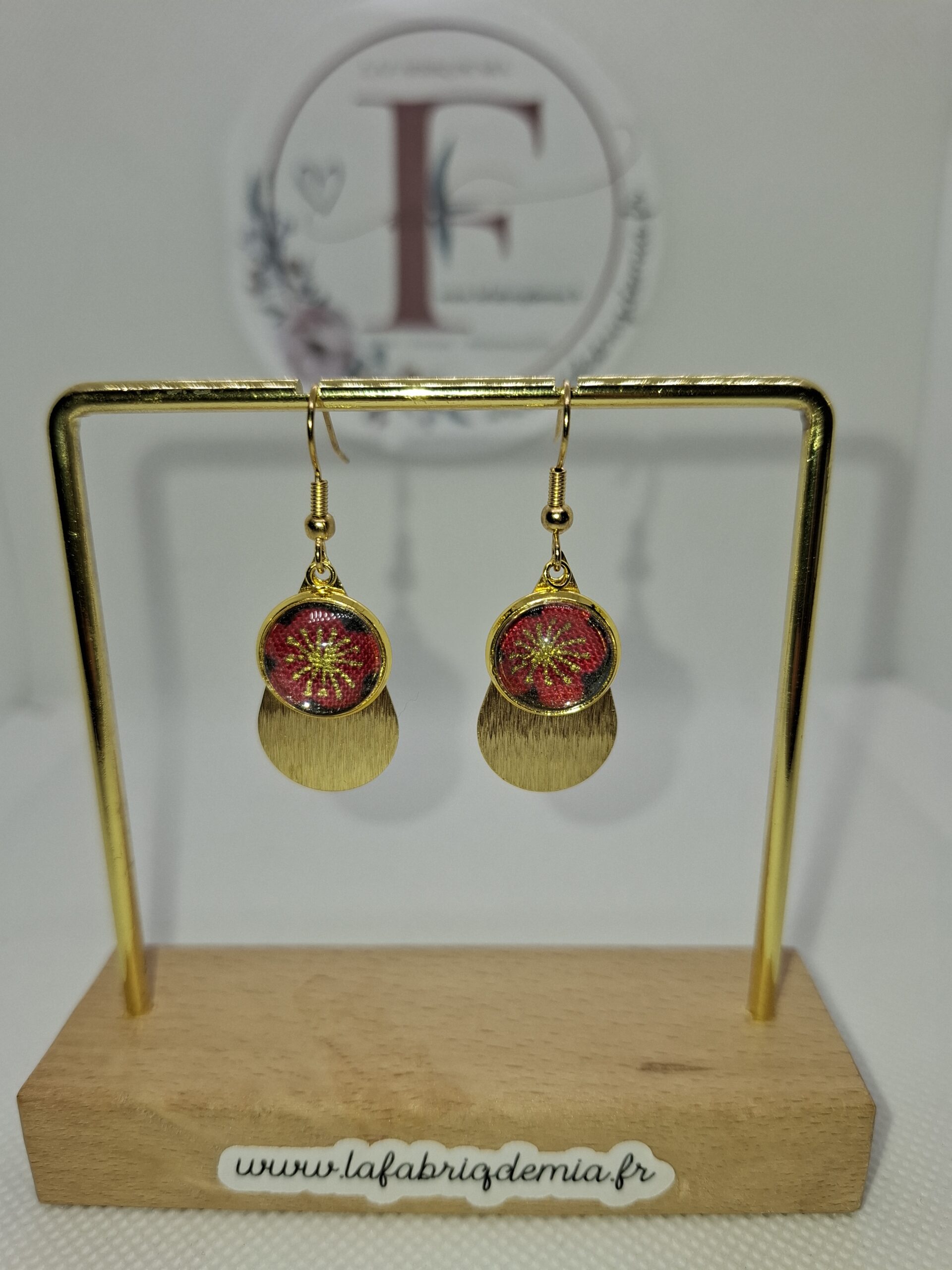 La boucle d’oreille est composée d’une estampe dorée 3cm de long et d’un cabochon motif fleur.