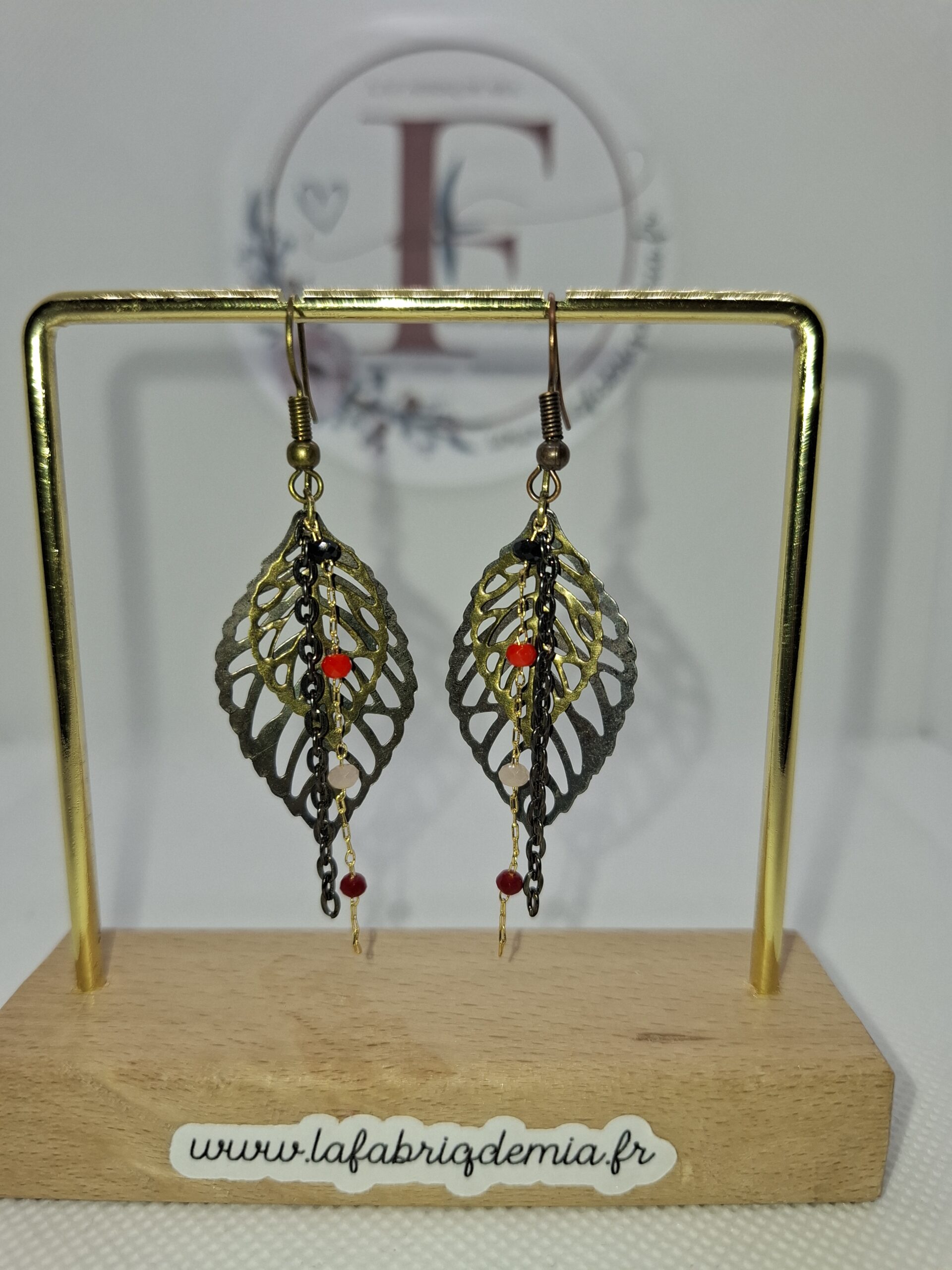 La boucle d’oreille est composée d’une feuille de laiton 3cm et une feuille de laiton 2cm et des chaines