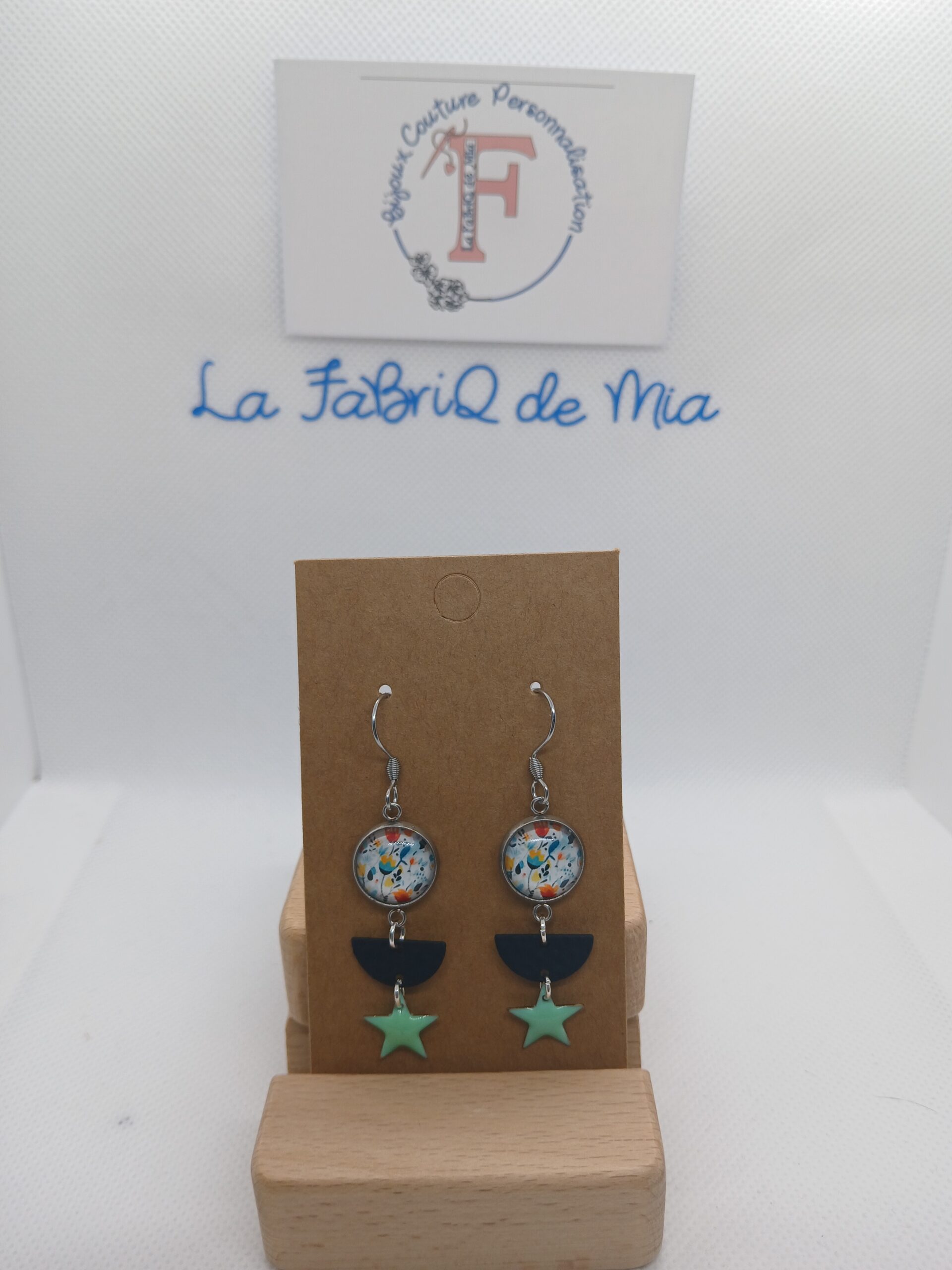 La boucle d’oreille est composée d’une étoile verte, cabochon et demi rond noir