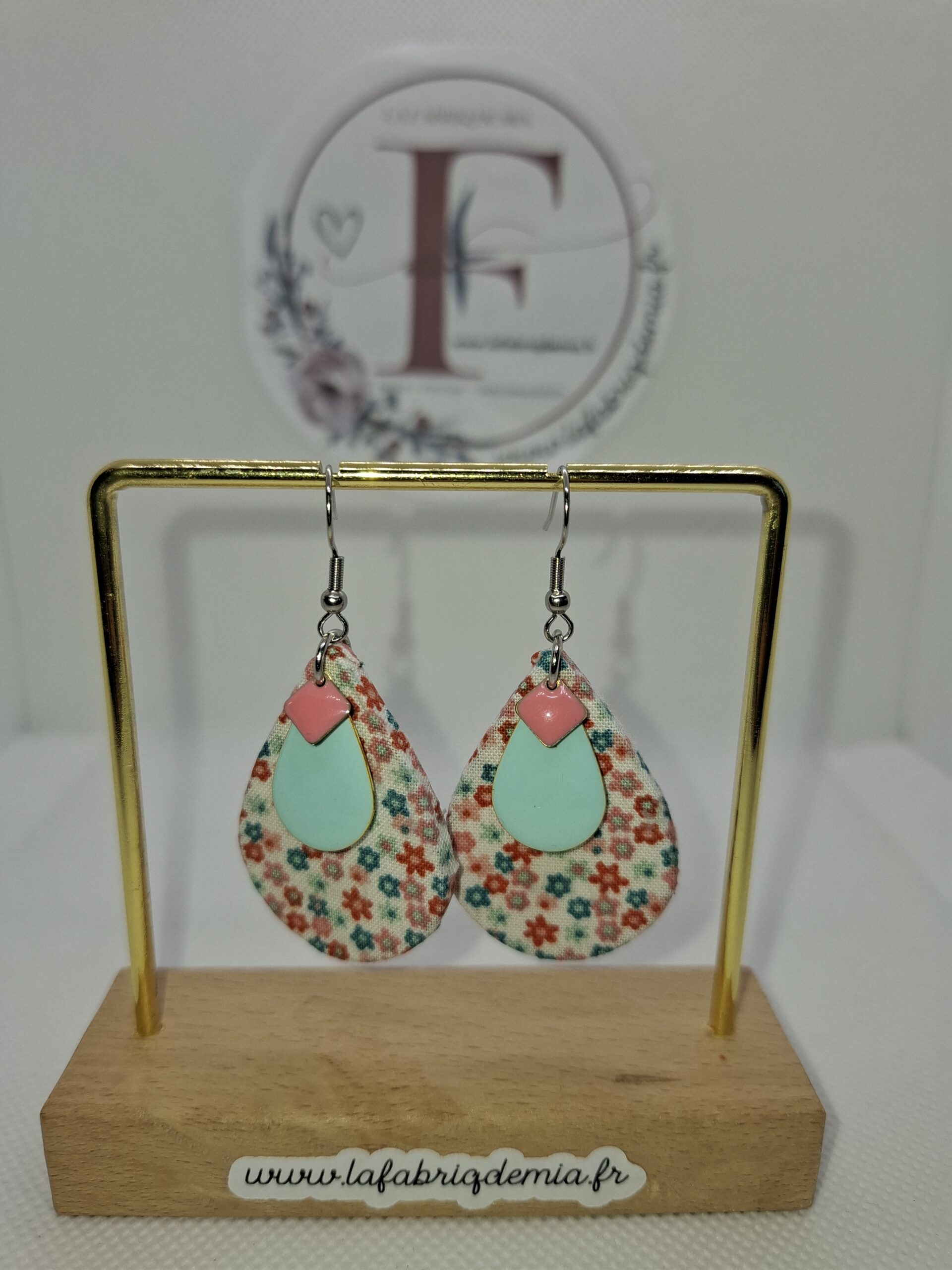 La boucle d’oreille est composée de bois recouvert de tissu coton (4cm de haut la goutte en bois)