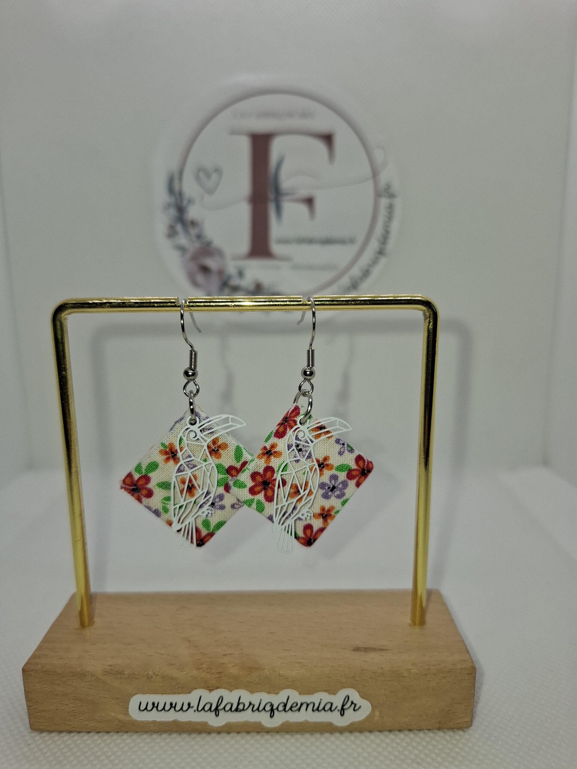 La boucle d’oreille est composée de bois recouvert de tissu coton (3cm de haut pour le carré en bois)