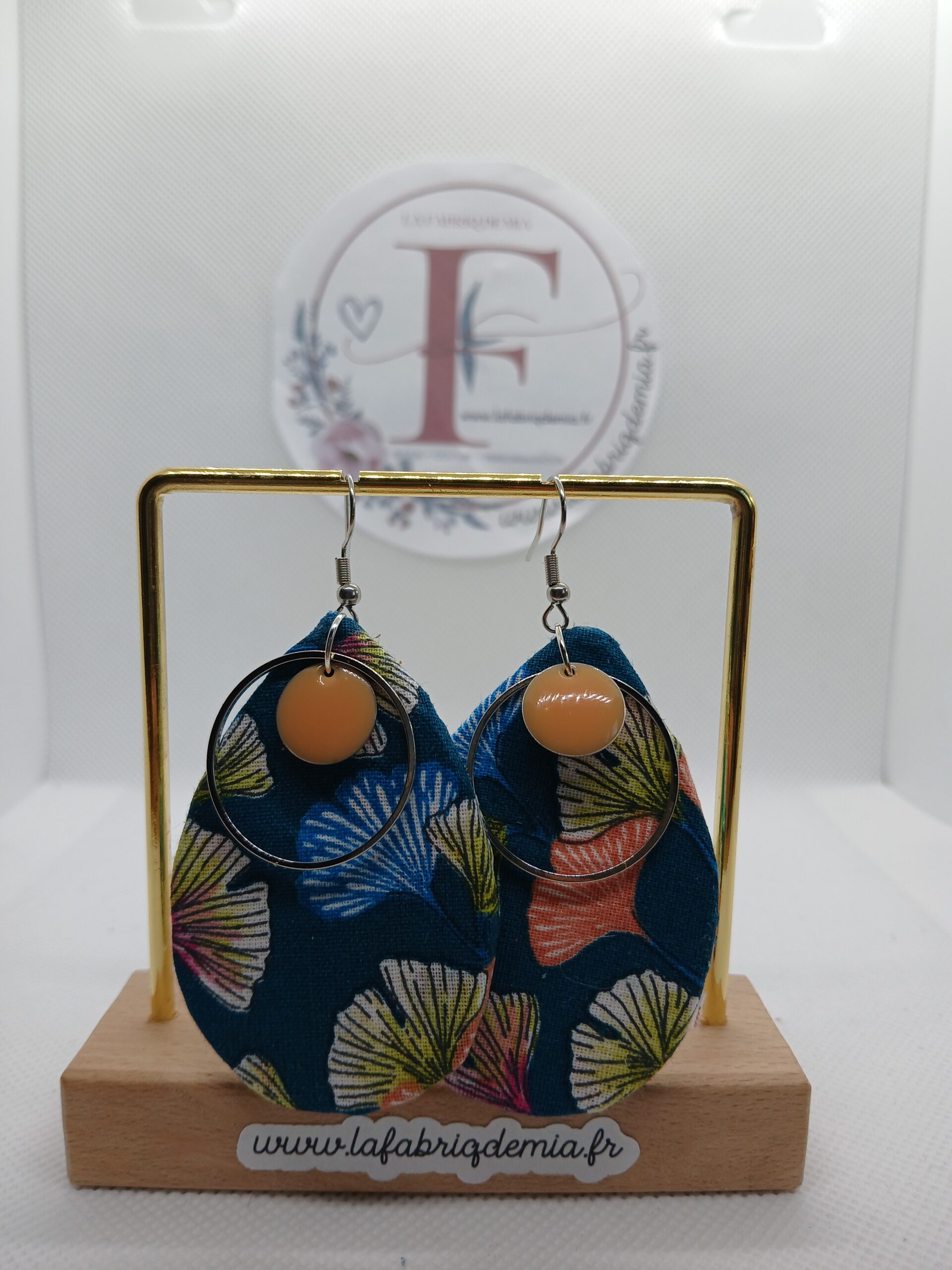 La boucle d’oreille est composée de bois recouvert de tissu coton (6cm de haut la goutte en bois)