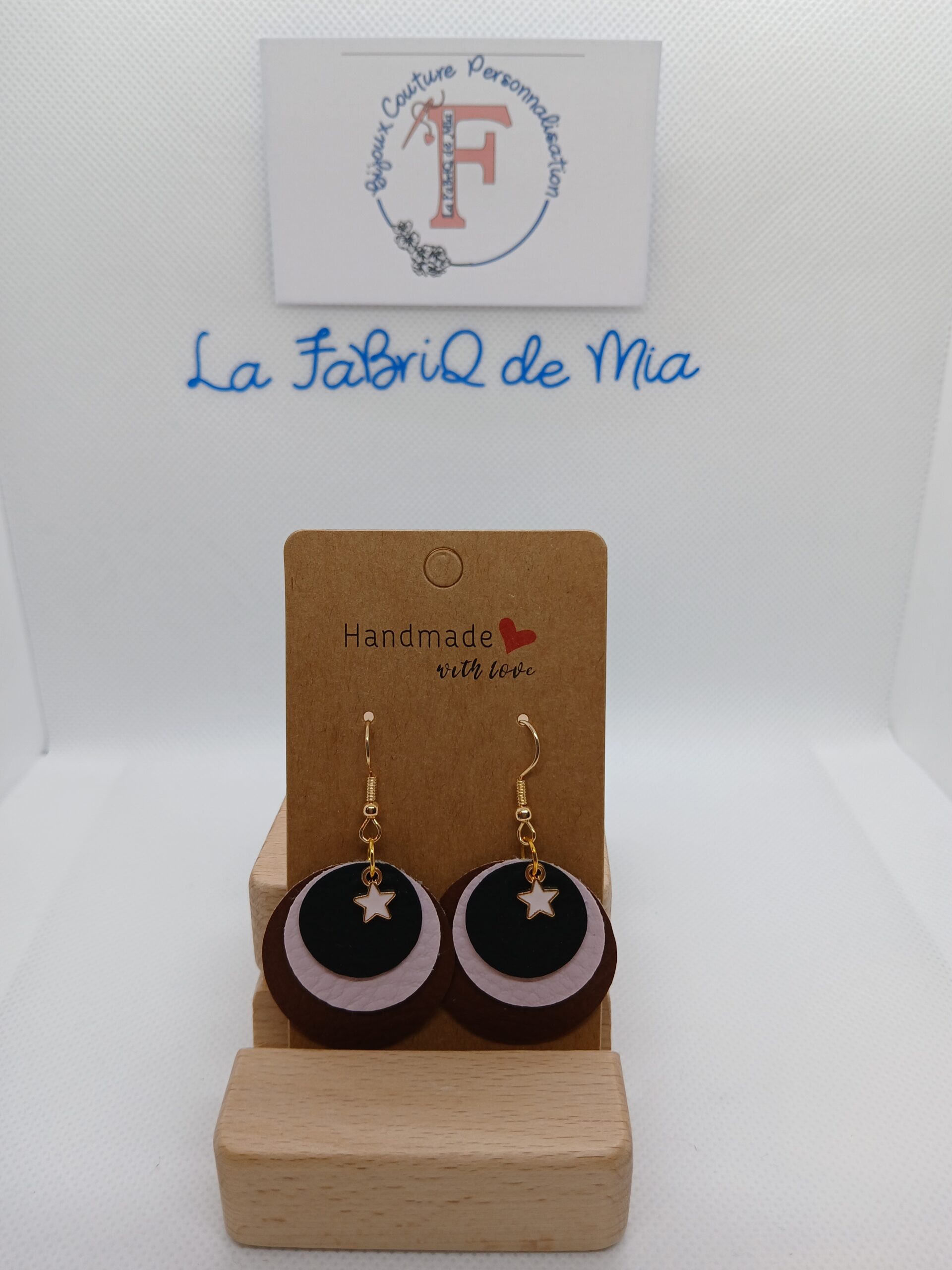 La boucle d’oreille est composée de trois ronds en simili cuir rose et marron agrémenté d’une étoile rose