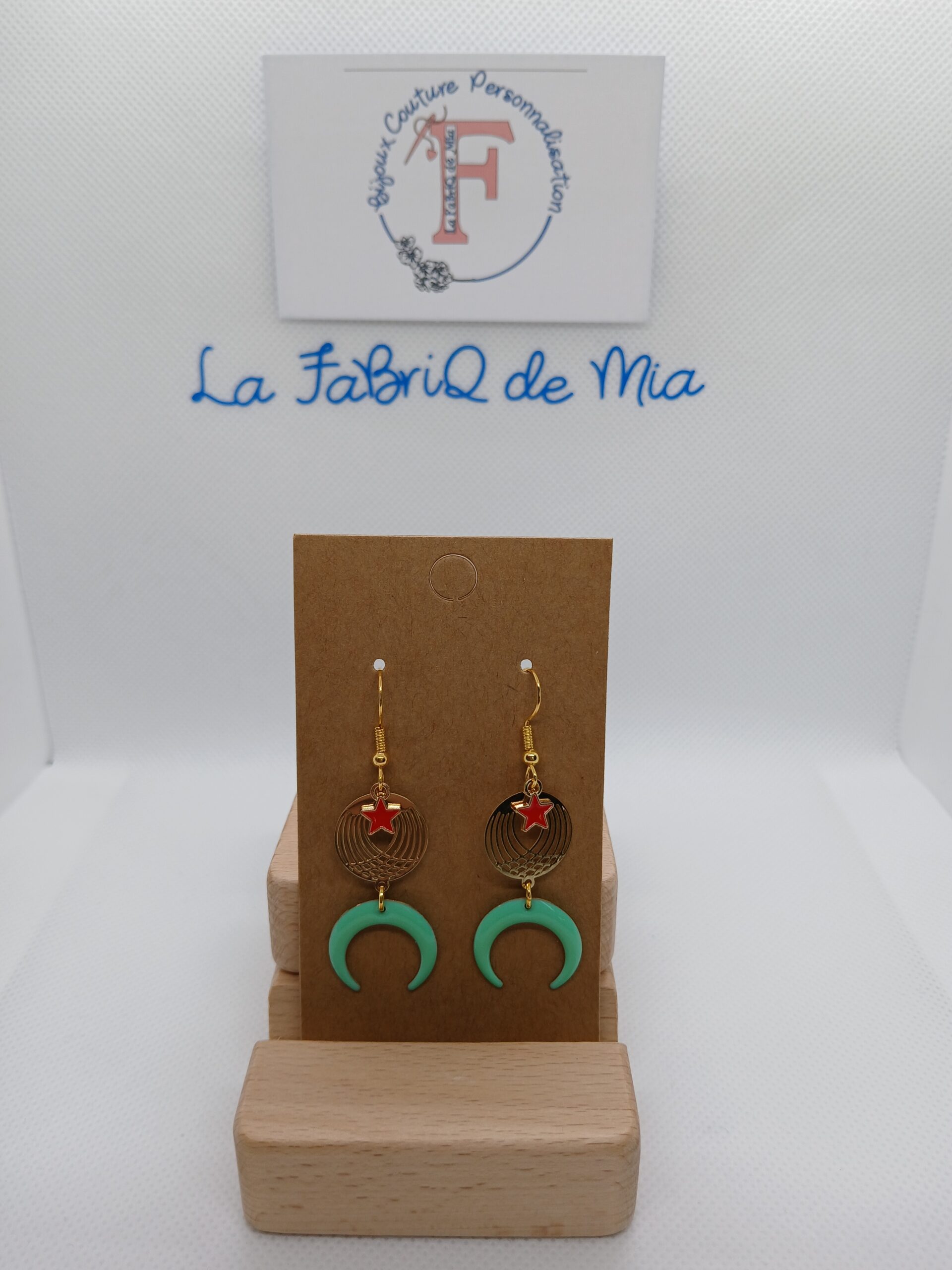 La boucle d’oreille est composée d’une demi lune verte, d’un médaillon doré et d’une étoile rouge
